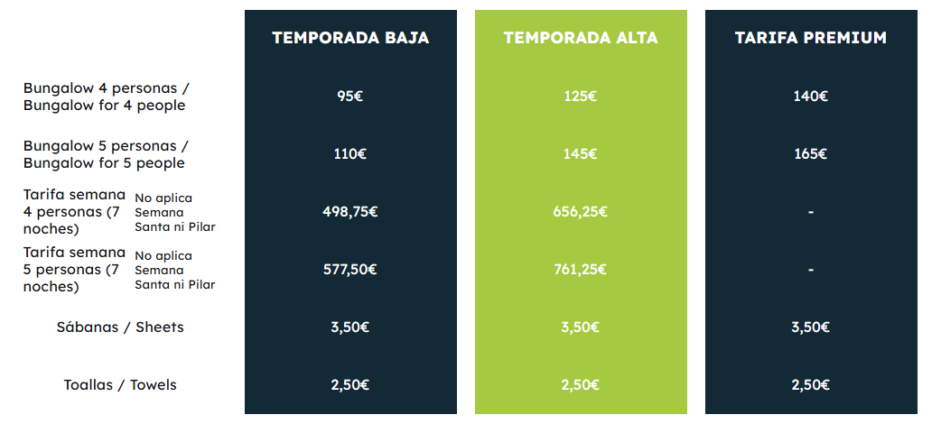 Las sábanas y toallas NO las incluímos en el precio, pero las puedes traer tú o alquilarlas en recepción por 3,50€ cada juego de sábanas y 2,50€ cada toalla.
